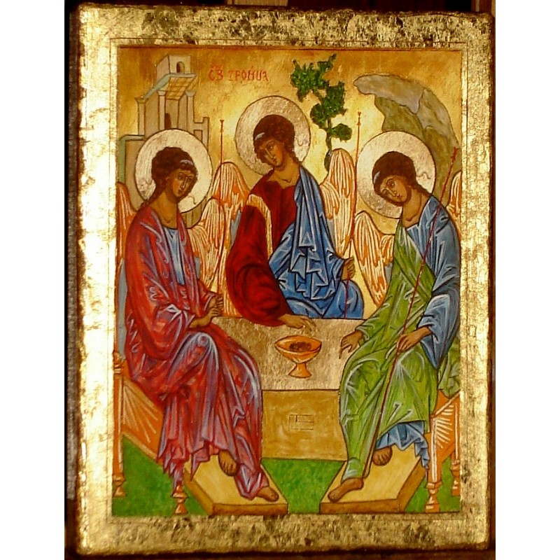 Ikona wykonana przez konserwatora zabytków na desce, technika reprodukcja, złocenia wykonane tradycyjną techniką płatkami imitującymi złoto.