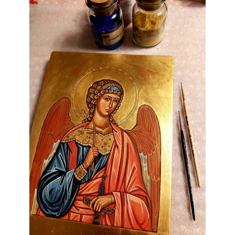 Ikona ręcznie pisana tj. malowana na desce lipowej, ręcznie złocona płatkami złota 23 3/4 Karat, werniksowana.